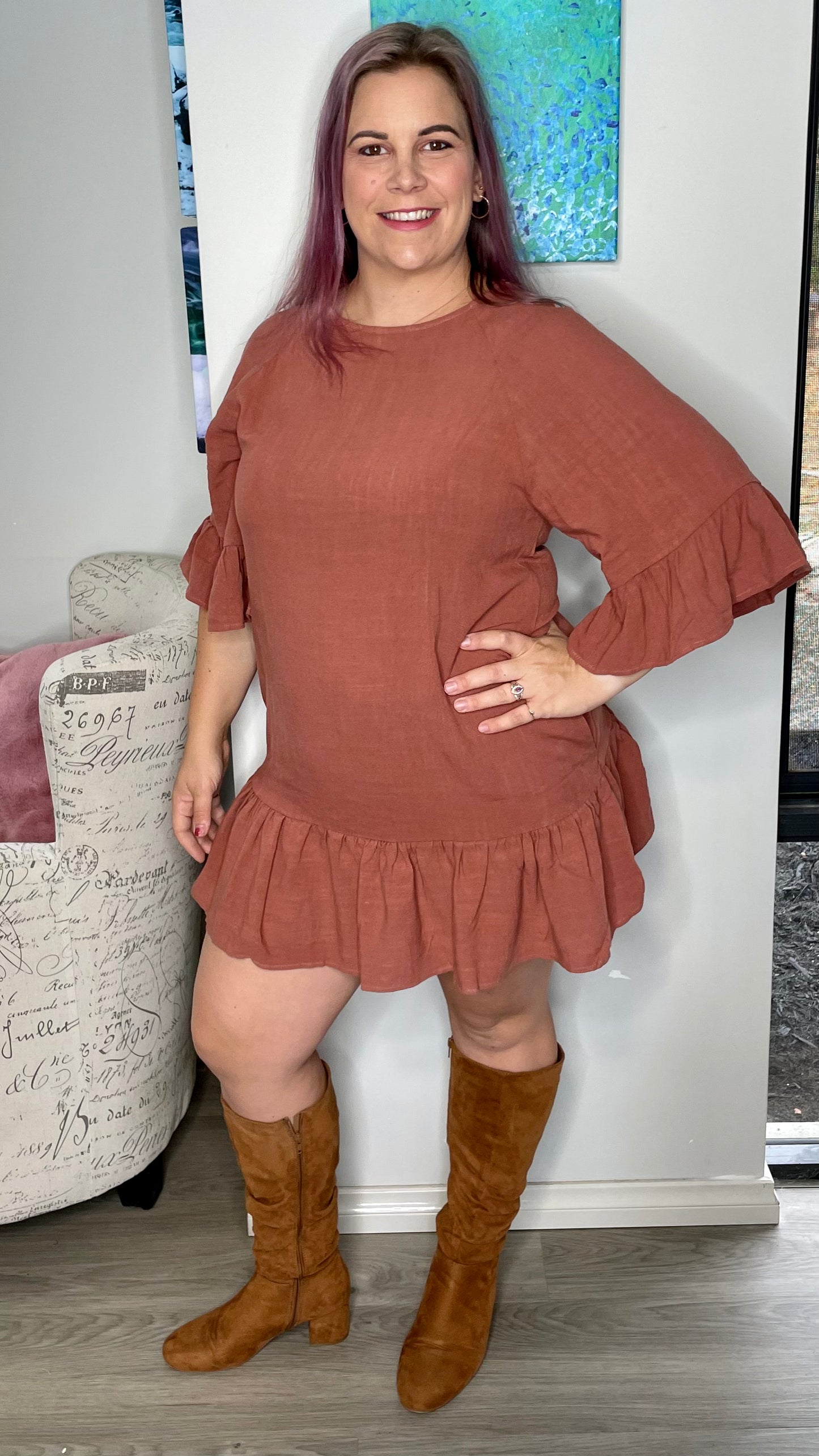Flattering and so easy to wear; this is your go-to easy wearing dress. It features a boat neckline and ruffled sleeves and hem for the perfect finish. Style with a belt for a more fitted look.