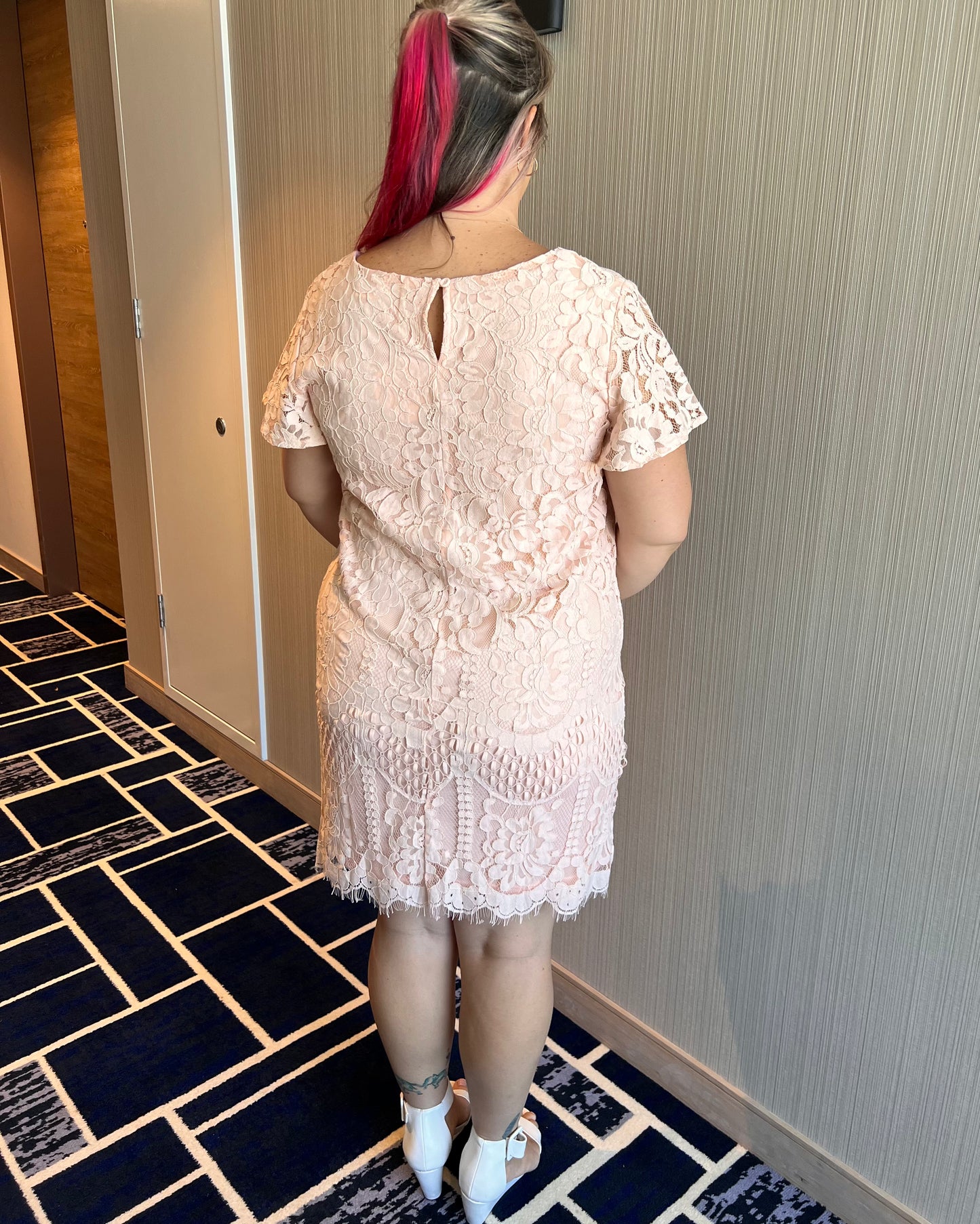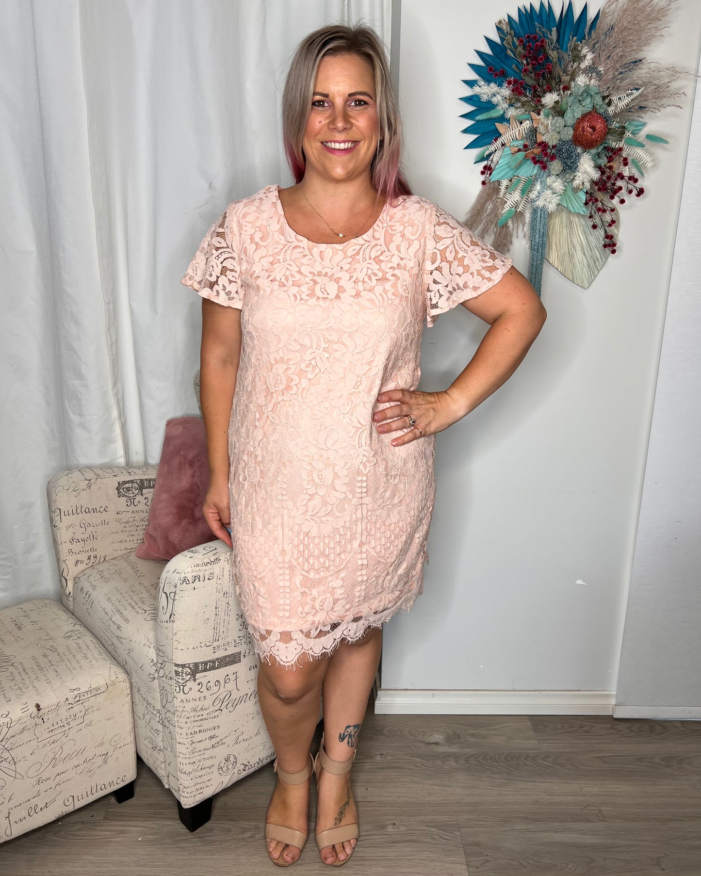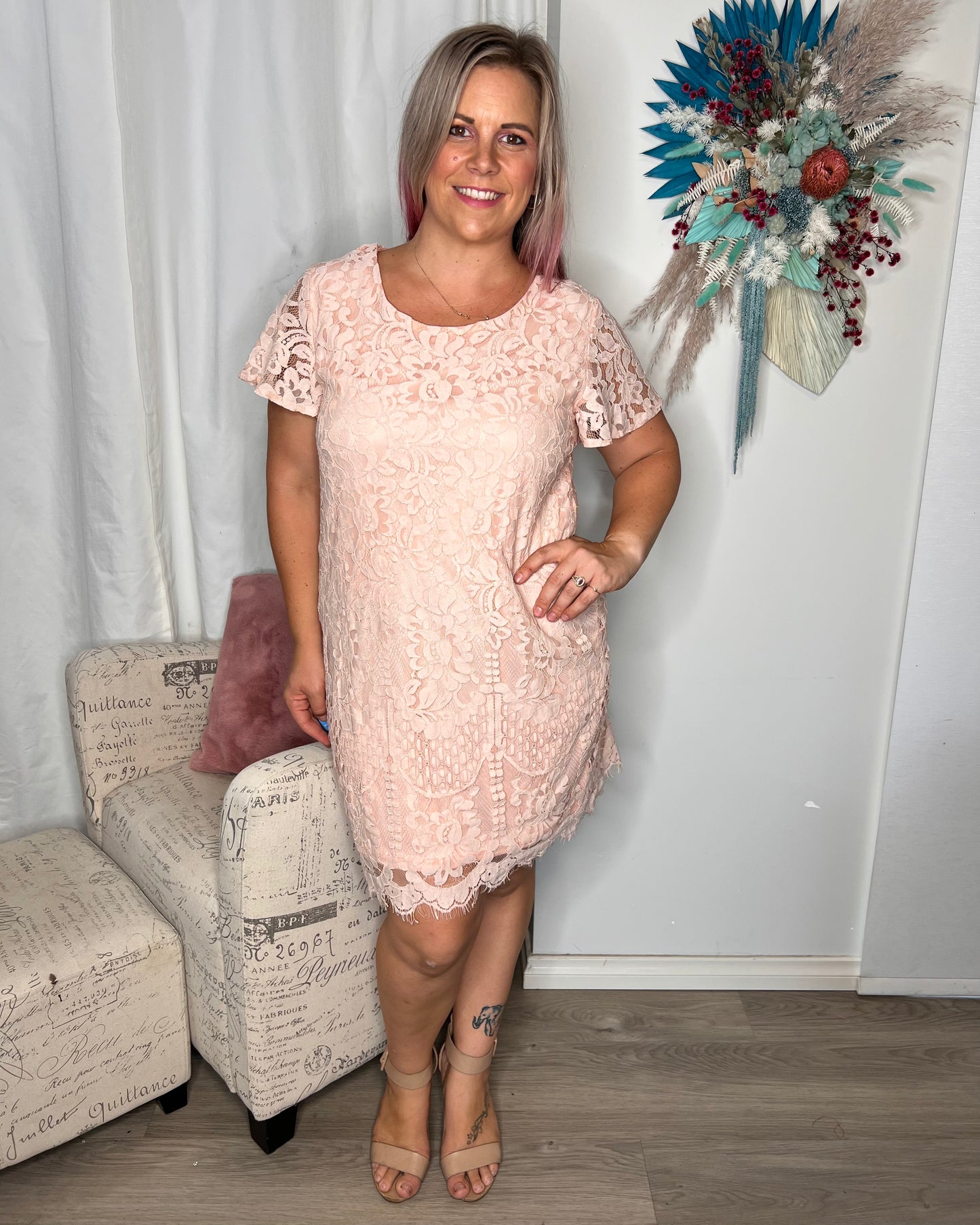 Mindy is the sweetest little lace shift dress