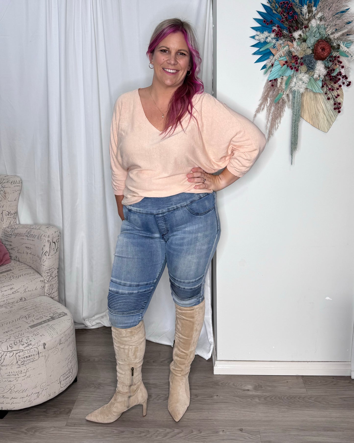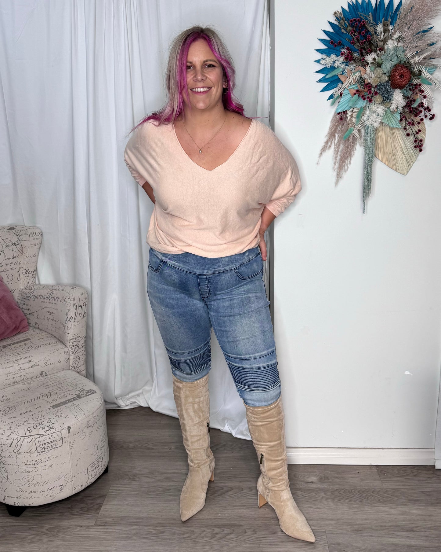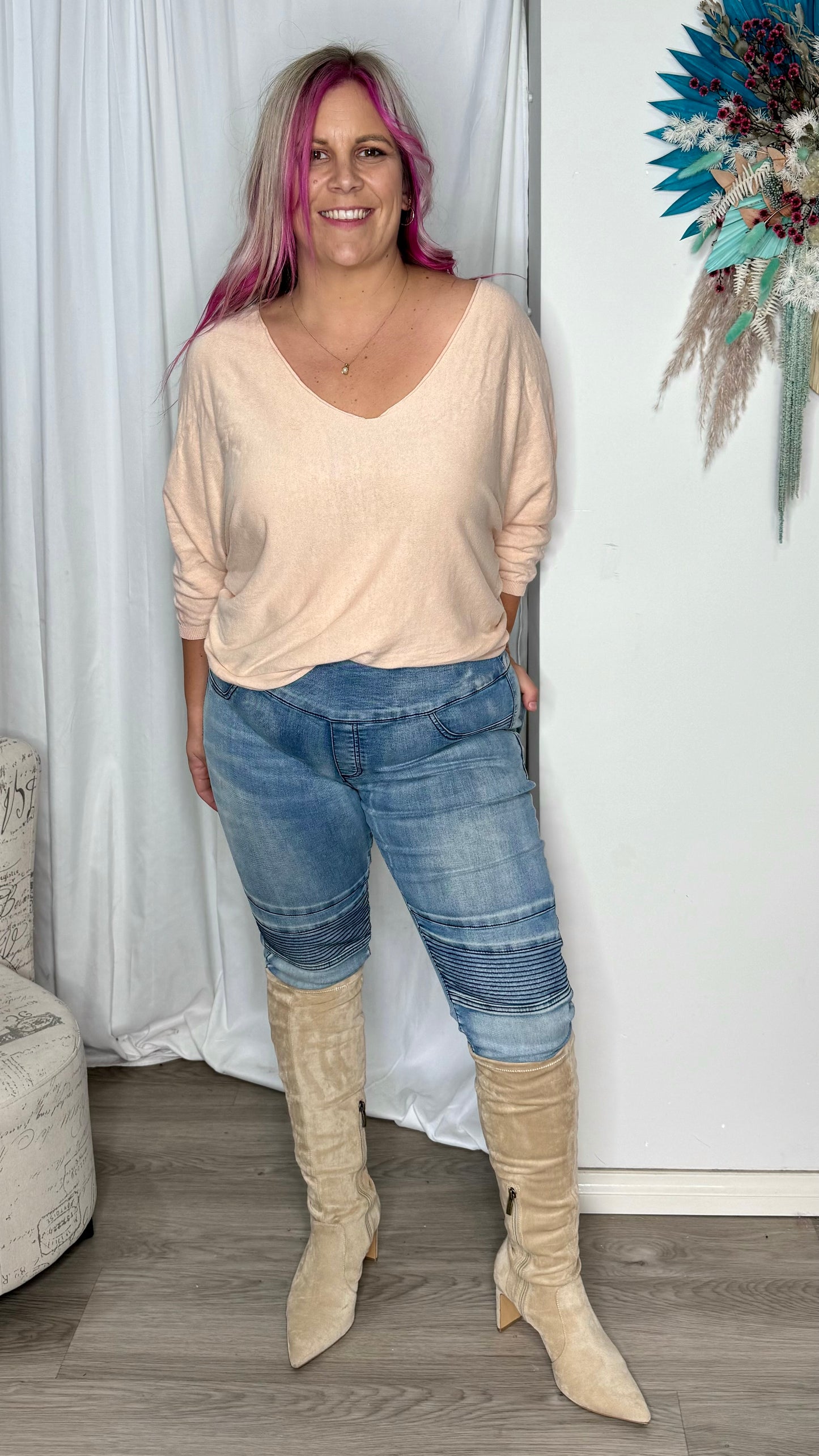 The ultimate in comfort. With the look of jeans but the comfort of leggings, you won’t want to take these off! With a comfortable and stretchy fit, these jeans allow you to move around with ease while still looking stylish. They are incredibly versatile and can be dressed up or down for any occasion. Whether you're running errands or going out for a night on the town, these jeans will keep you looking and feeling great. Try them out for yourself and see why everyone is raving about our Wakee Panel Jeans